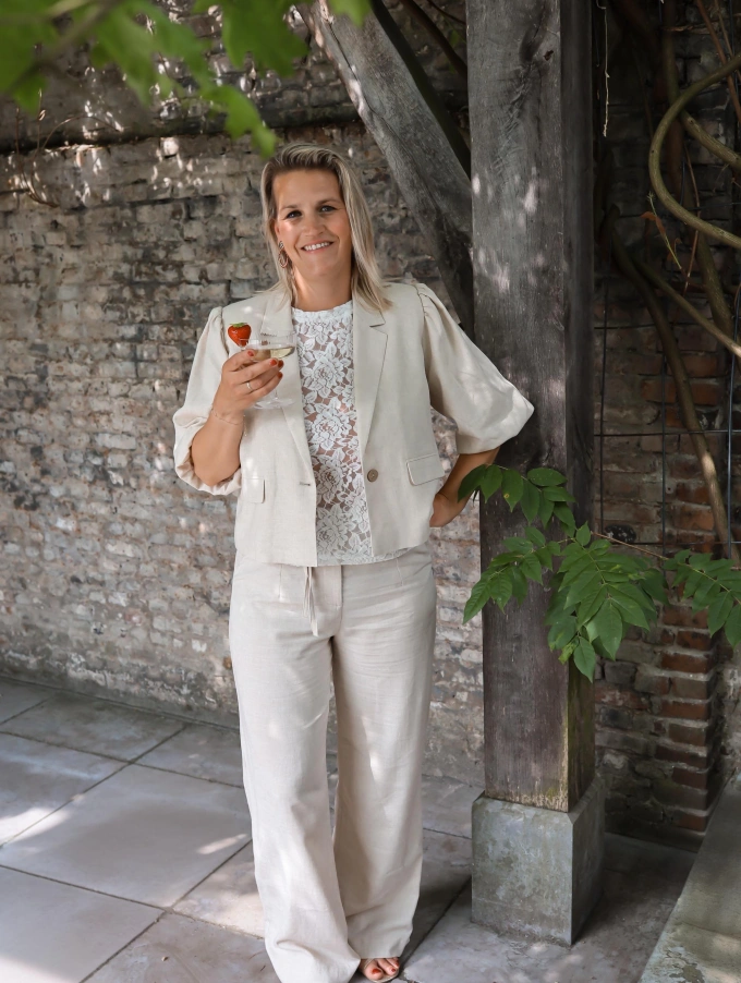 4 items gevondenDit beige linnen pak van Elvira is perfect voor een bruiloft of een andere feestelijke gelegenheid. De Linnen broek Lynn heeft handige steekzakken en een knooplint in de taille, waardoor hij mooi aansluit. De bijpassende blazer Lynn maakt de look compleet met zijn elegante knoopsluiting en steekzakken. Draag er de Top Mila onder, verkrijgbaar in zacht ivoor wit, voor een lichte en zomerse uitstraling. Maak je outfit af met de gouden sandalen van Tamaris met een kleine blokhak en een fijne enkelsluiting. Een chique en comfortabele look die helemaal bruiloft-proof is!