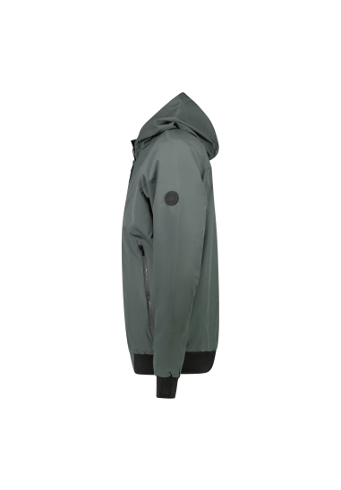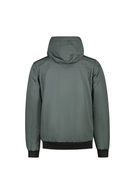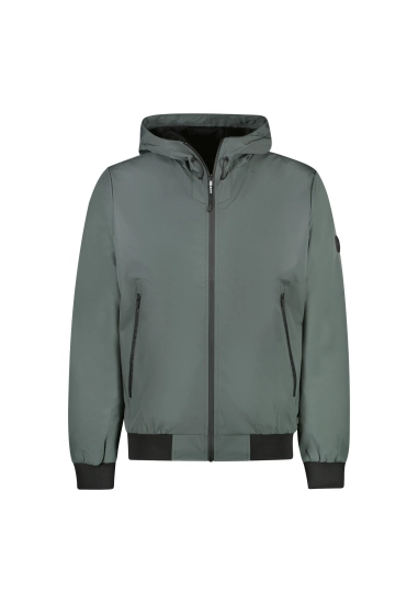 Met capuchon en elastieken boord onderaan de jas en bij de mouwen.