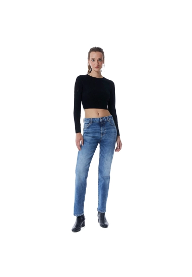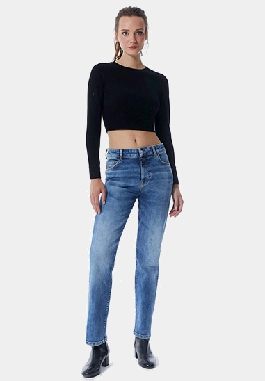 Deze broek heeft een rechte pasvorm en hoge taille.
