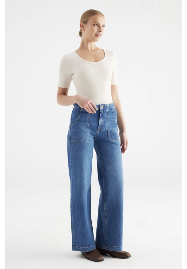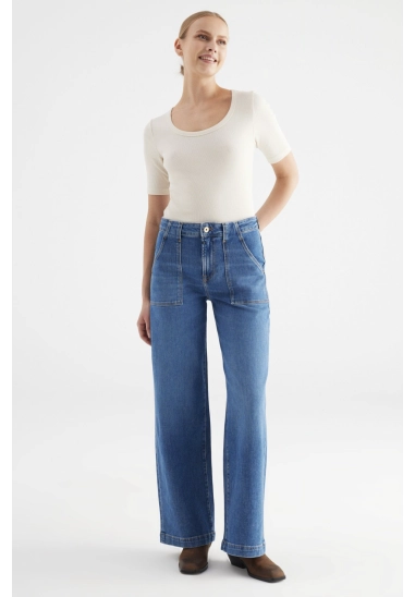 De Lulu Jeans is een wide leg broek met een comfortabele stretch. De jeans heeft een high waist model met grote zakken die doorlopen naar riemlussen. De pasvorm is aangesloten rond het zitvlak en recht vanaf de dij tot aan de enkel.De jeans is gemaakt van een denim stof en is afgewerkt met een ritssluiting en subtiele details.