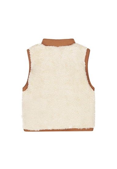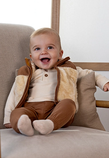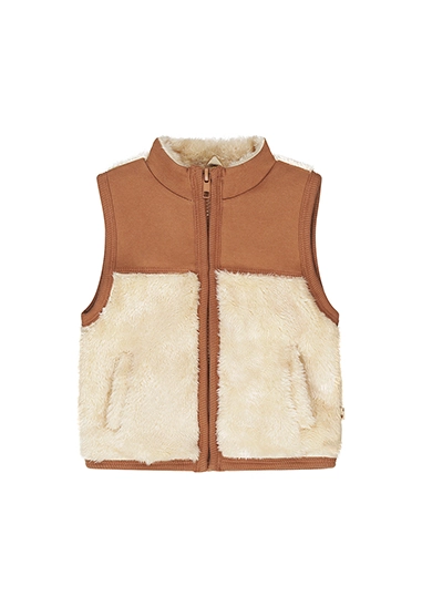 Bodywarmertje voor baby jongens van het merk Dirkje. Deze bodywarmer is verkrijgbaar in een een zand kleur gecombineerd met bruin.