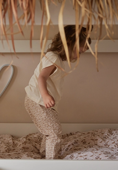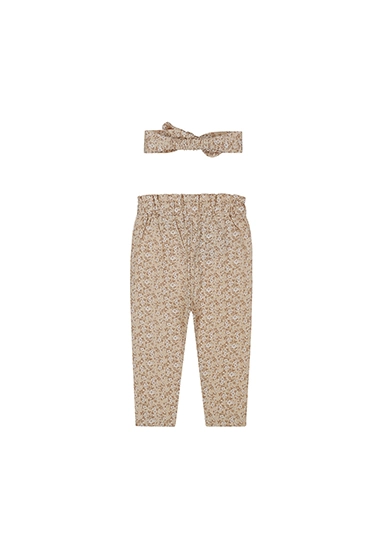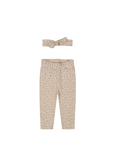 Broekje met haarbandje met print voor baby meisjes van het merk Dirkje. Het broekje en haarbandje is verkrijgbaar in beige. Het broekje hoort bij het Girls little flower thema van Dirkje voor de zomer van 2025.