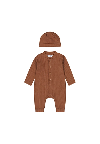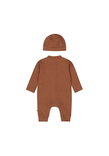Eendelig paktje met muts voor baby jongens van het merk Dirkje. Het pakje is verkrijgbaar in bruin.