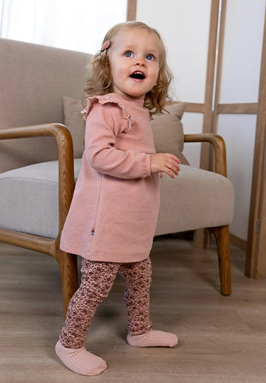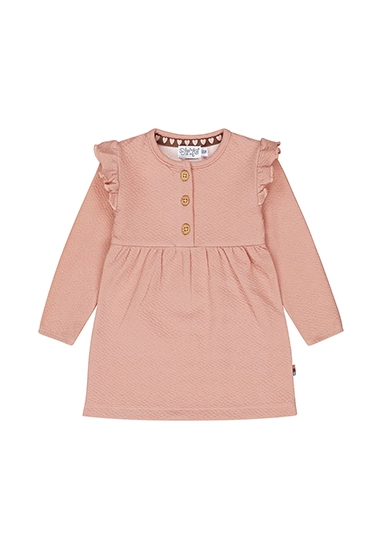 Jurkje voor baby meisjes van het merk Dirkje. Dit jurkje met rouches is verkrijgbaar in het roze.
