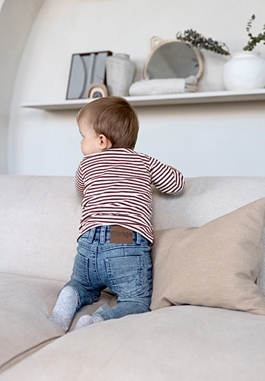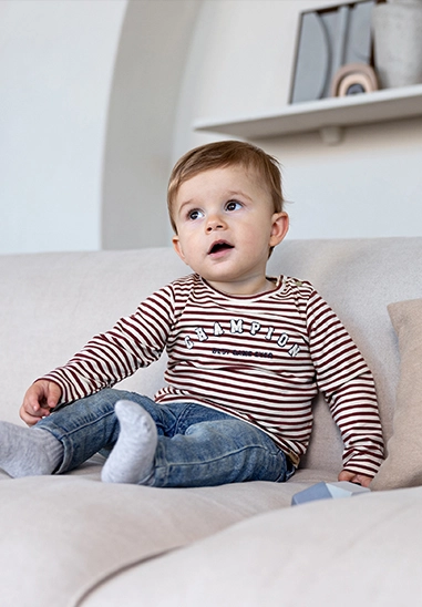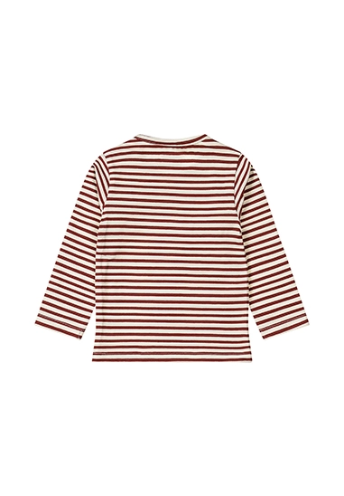 Shirtje met lange mouwen voor baby jongens van het merk Dirkje, Het gestreepte shirts is verkrijgbaar in een rode met beige kleur.