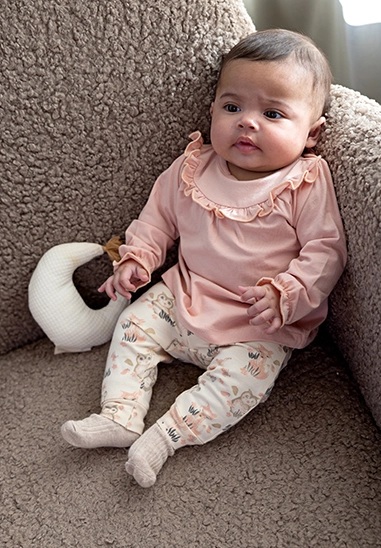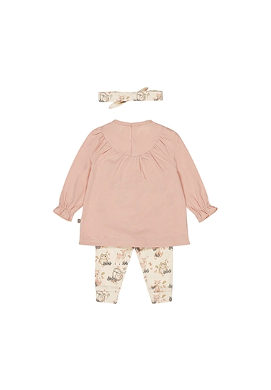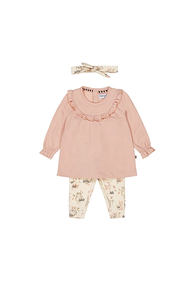 Tweedelig pakje met haarbandje voor baby meisjes van het merk Dirkje. Het jurkje is roze en de legging in haarband hebben een mooie print op ivoor witte basiskleur.