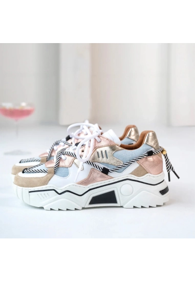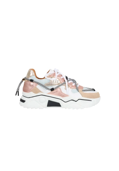 Met een hoge, dikke zool, leren en metallic details en opvallende veters die doorlopen op de hak, trek je zeker de aandacht.