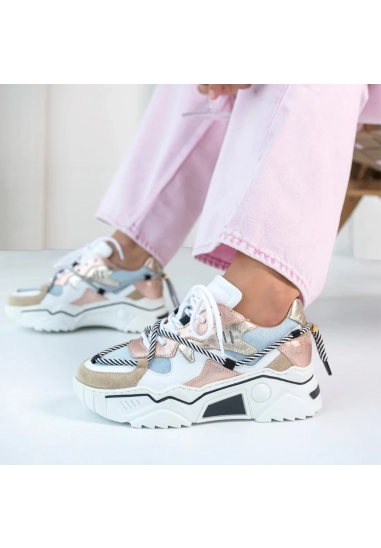 Verkrijgbaar in de kleur wit met rose, brons, beige en lichtblauwe details.
