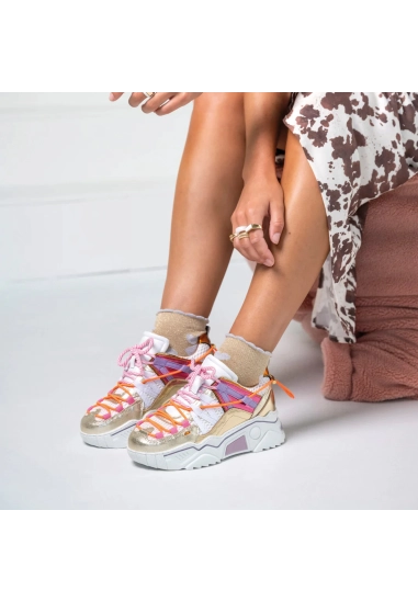 Deze sneaker voor dames is aan de buitenzijde van mesh stof en metallic en aan de binnenzijde is volledig van leer.