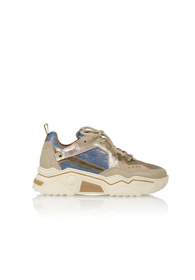 Sneakers Pluto denim voor dames van het merk Dwars. Deze toffe leren sneakers zijn verkrijgbaar in gouden met denim kleuren.