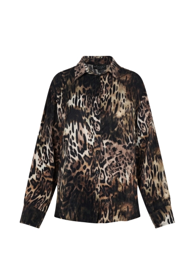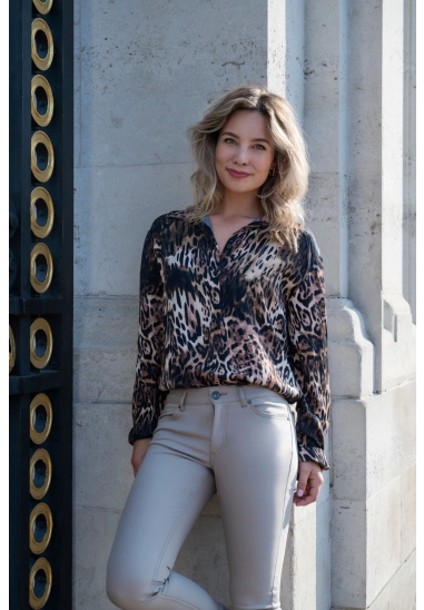 Blouse Amelie voor dames van het merk Elvira Collections. De blouse heeft een lange mouw en een mooie leopard print. Verkrijgbaar in een donker blauwe ondergrond met ivoor witte prints.