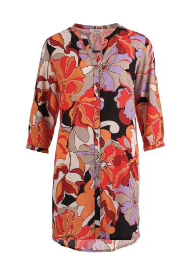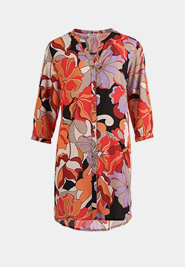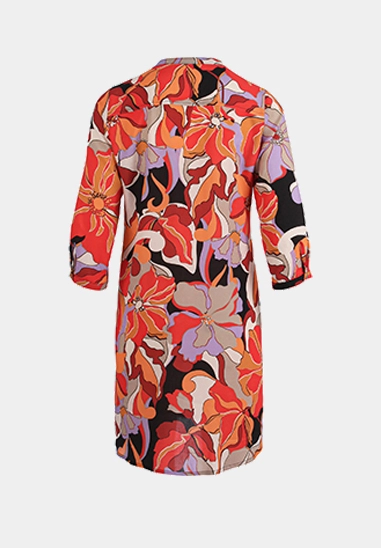 Verkijgbraar in een rode en paarse allover bloemprint.