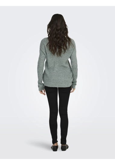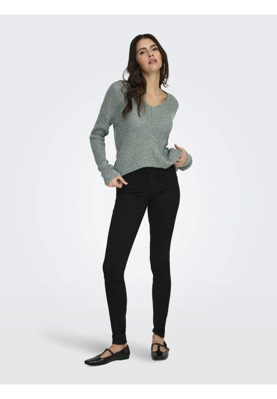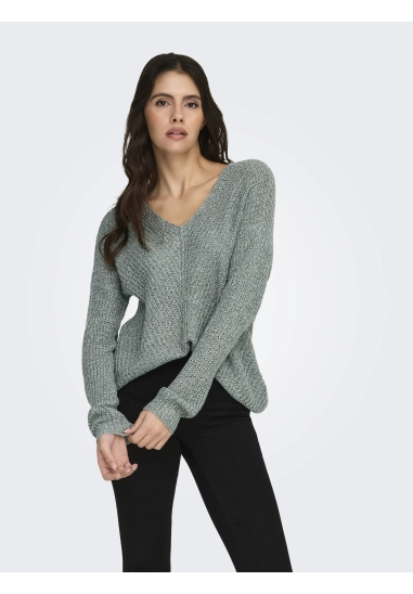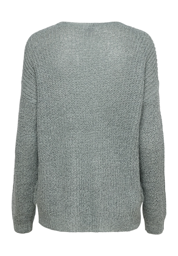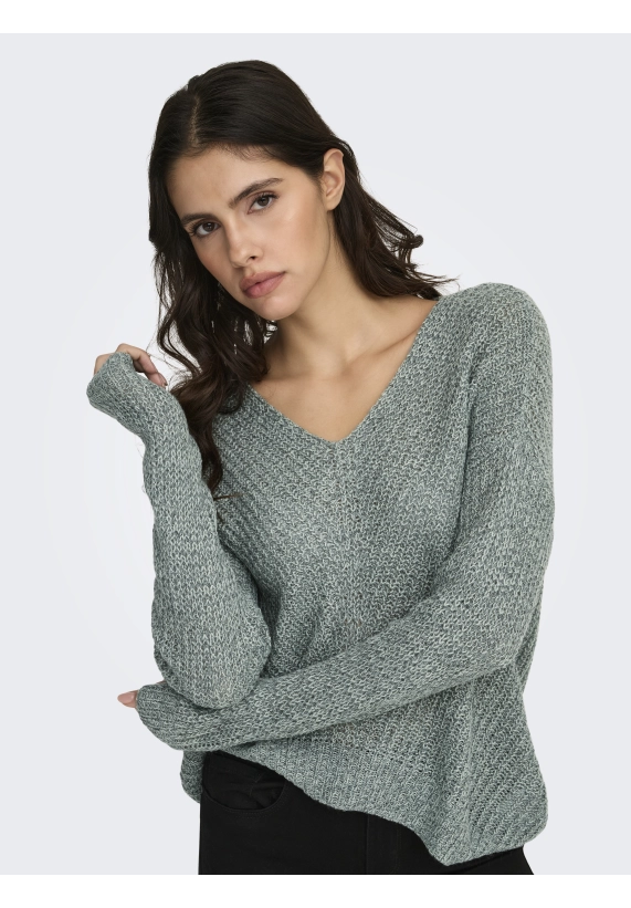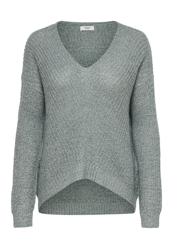 De trui is gebreid, heeft een V-hals en de achterkant is langer.