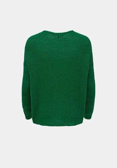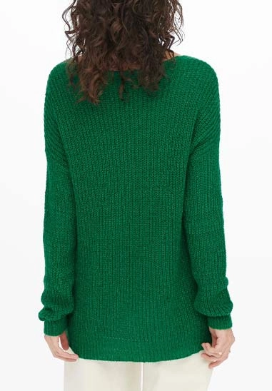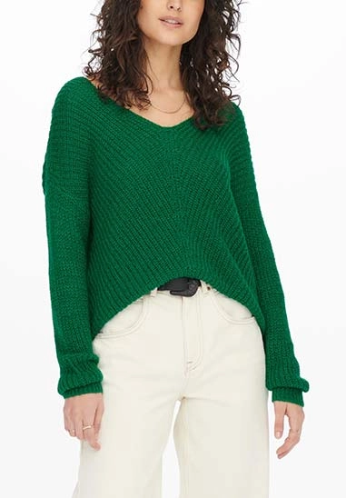 De trui is gebreid, heeft een V-hals en de achterkant is langer.