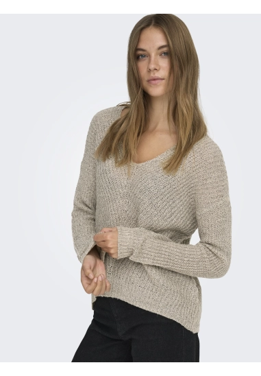 De trui is gebreid, heeft een V-hals en de achterkant is langer.
