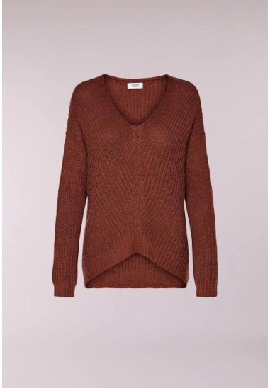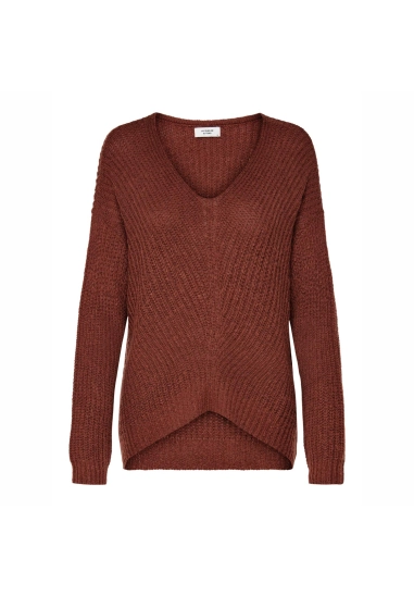 De trui is gebreid, heeft een V-hals en de achterkant is langer.