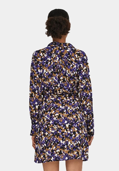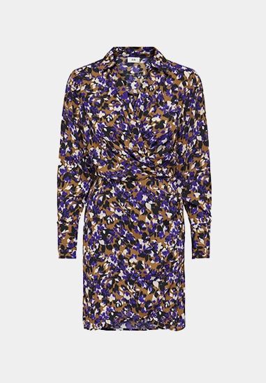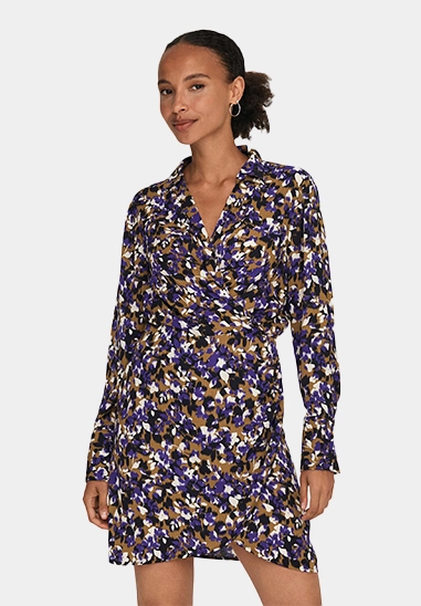 Deze overslag jurk heeft lange mouwen, een kraag.