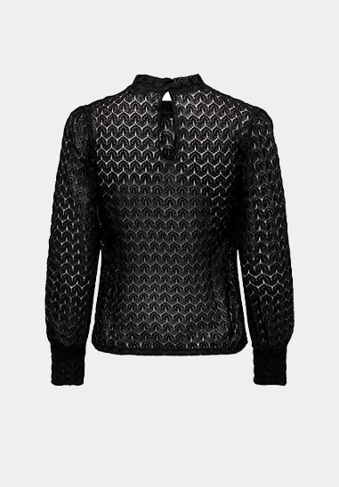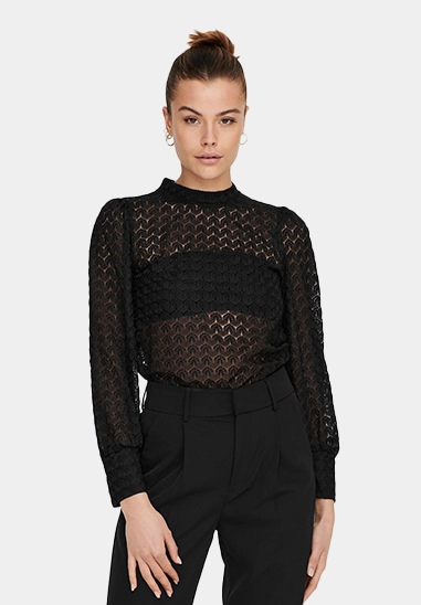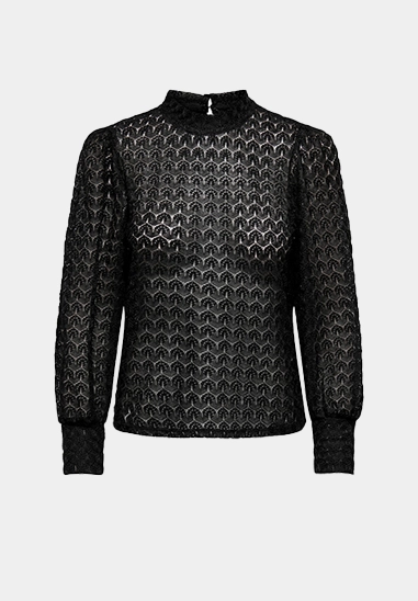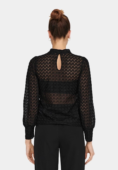Dit shirt met kanten patroon heeft een opstaande hals.