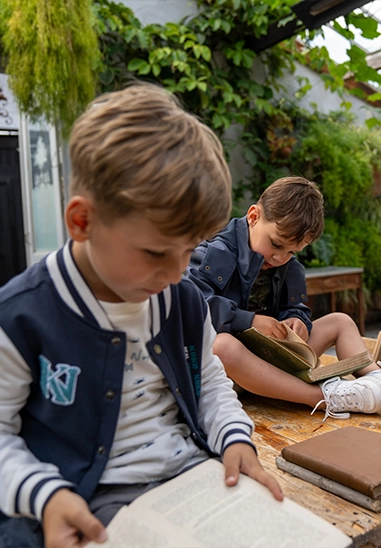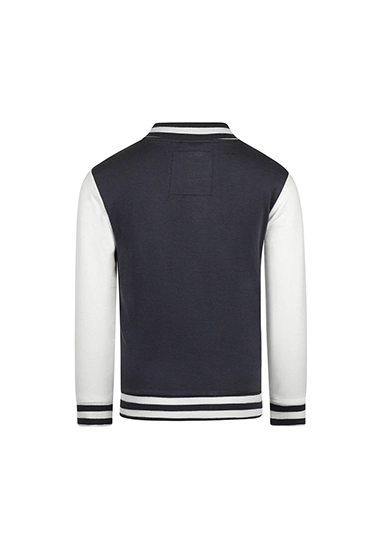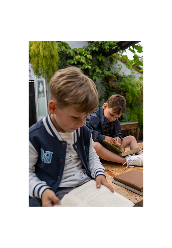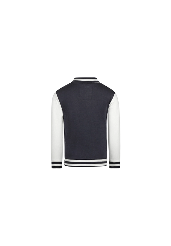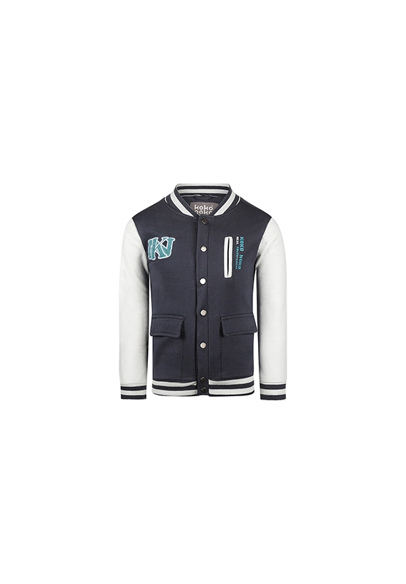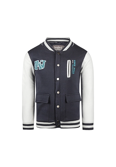 Baseball jack voor jongens. Dit toffe baseball jack heeft prints en is van het leuke merk Koko Noko. De jas heeft een donker blauwe body en ivoor witte mouwen. Perfect te combineren met heel veel stijlen van de zomercollectie 2025 van Koko Noko.