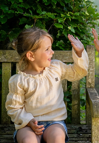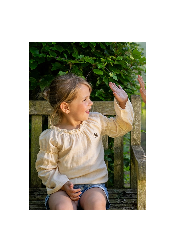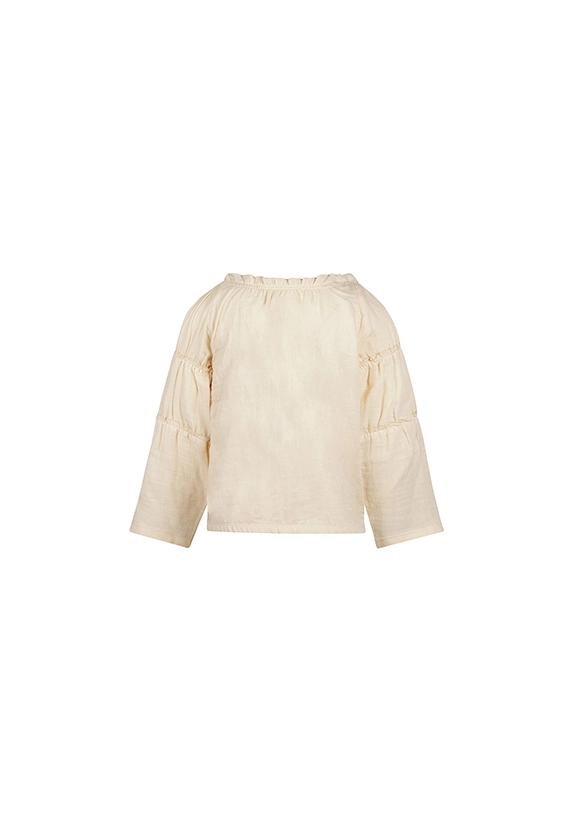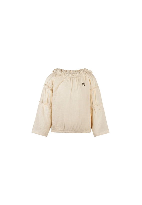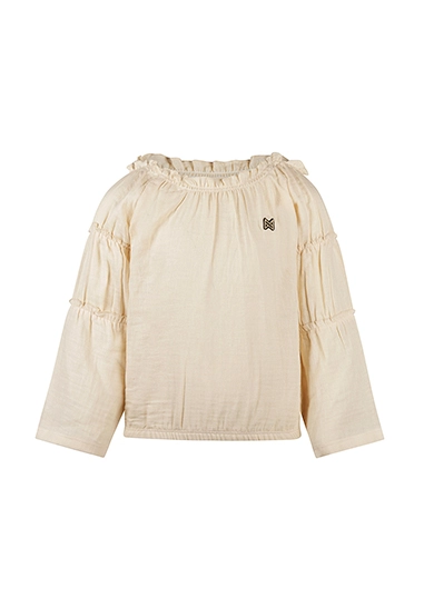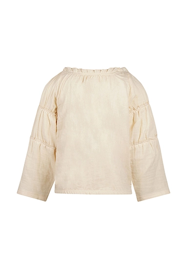 Blouse lange mouwen voor meisjes. De blouse heeft smocked details en is van het toffe merk Koko Noko. De blouse is verkrijgbaar in het ivoor wit en is super te combineren met heel veel andere stijlen uit de zomer 2025 collectie van Koko Noko.