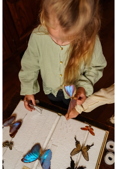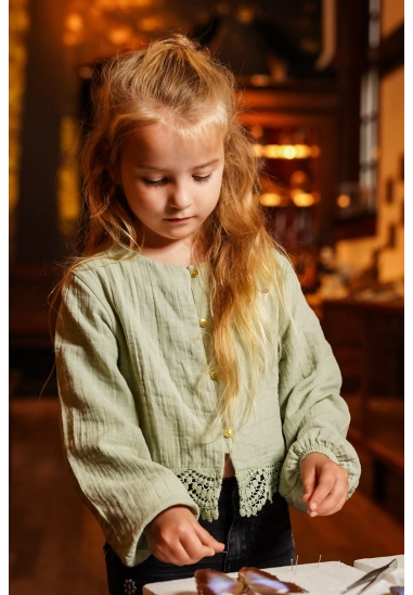 Het kanten detail aan de boord en de gouden knopen maken de blouse extra leuk.