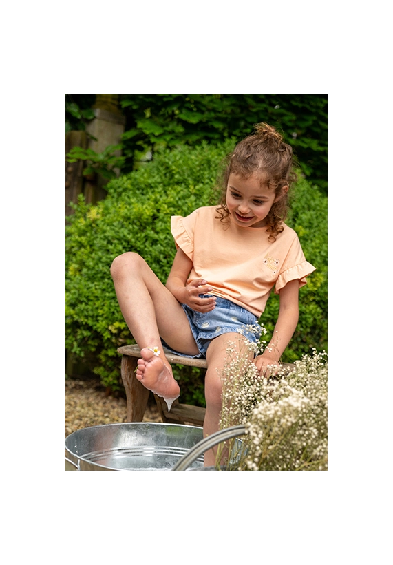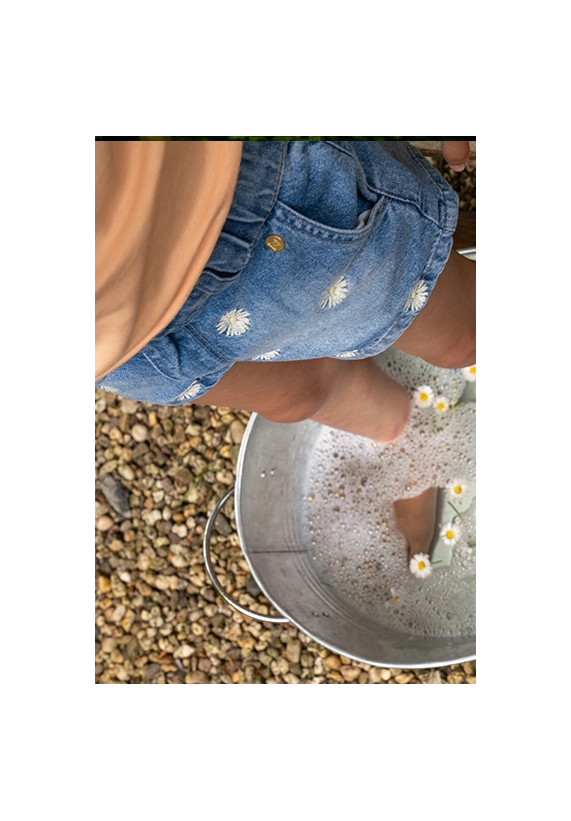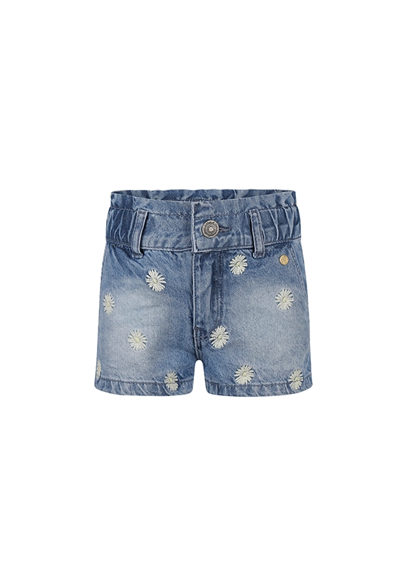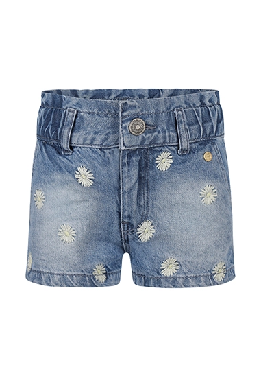 Denim short voor meisjes. De korte broek heeft een elastische band en is van het toffe merk Koko Noko. Op de voorzijde zijn bloemetjes geborduurd en de short is super te combineren met vrijwel alle andere stijlen uit de zomer 2025 collectie van Koko Noko.
