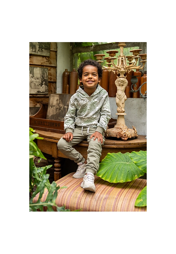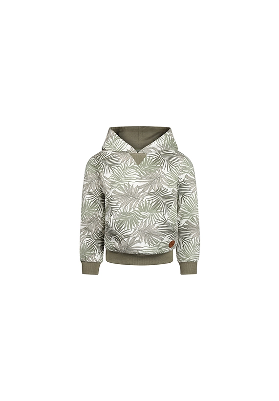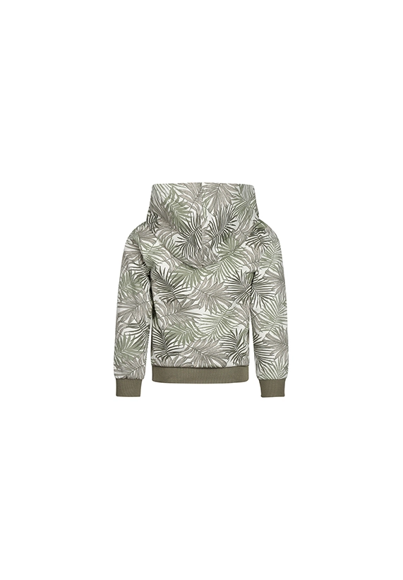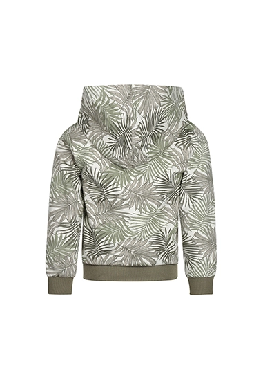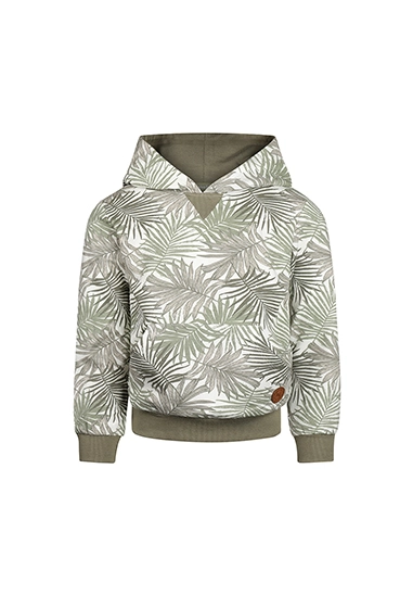 Sweater met capuchon voor jongens. Deze hoodie heeft een allover print van palmbladeren en is van het merk Koko Noko. De sweater is verkrijgbaar in een groene kleurencombinatie.