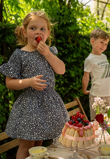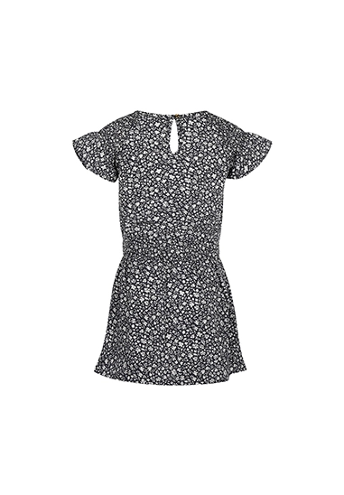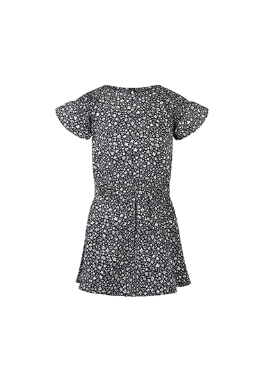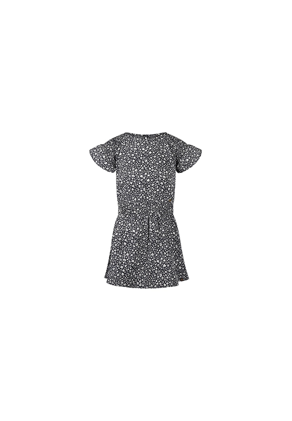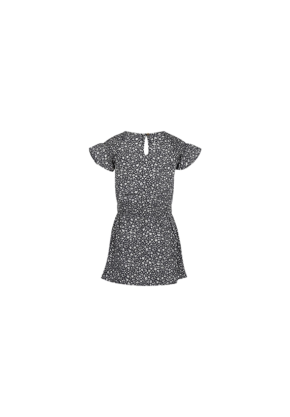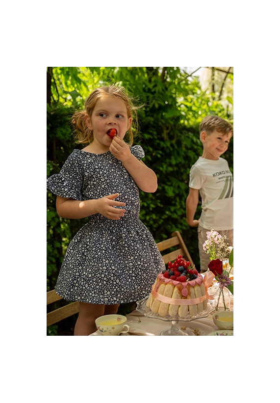 Jurk korte mouwen voor meisjes. De jurk heeft een allover print. De jurk is van het super leuke kindermerk Koko Noko. De hoofdkleur van de print is donker blauw. De jurk past heel goed in de zomercollectie 2025 van Koko Noko.