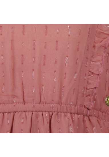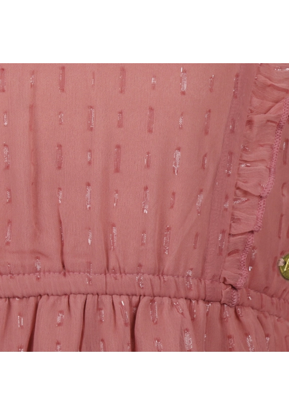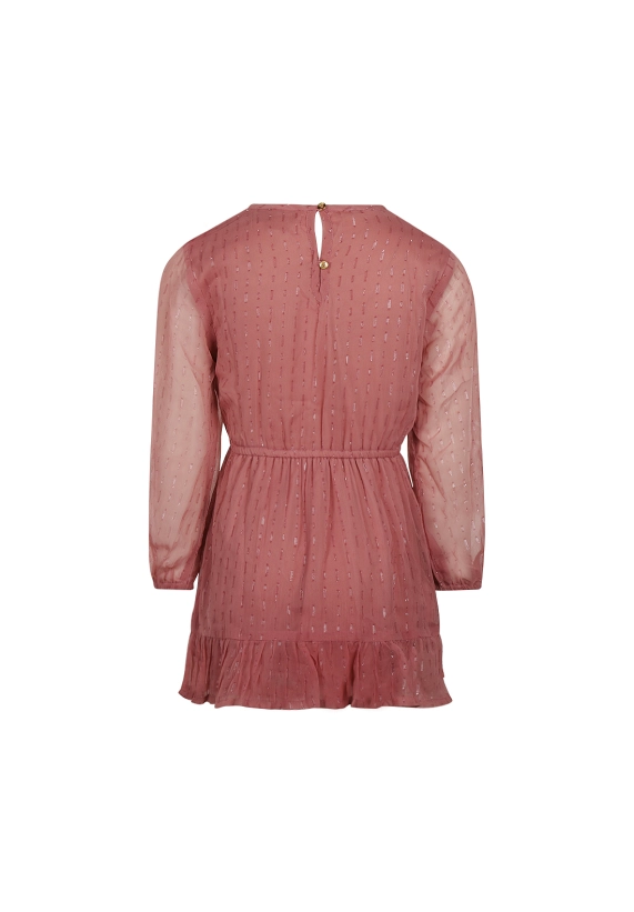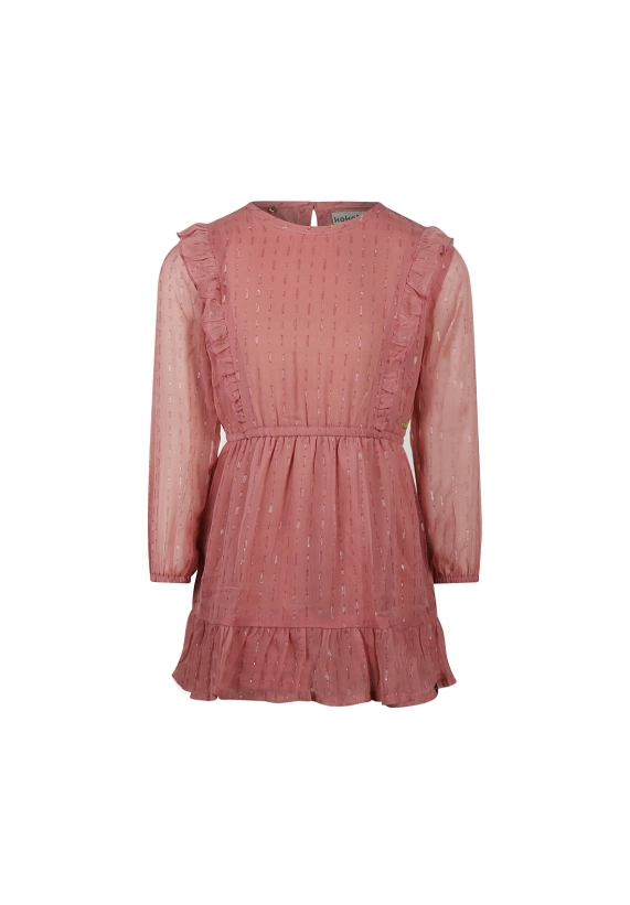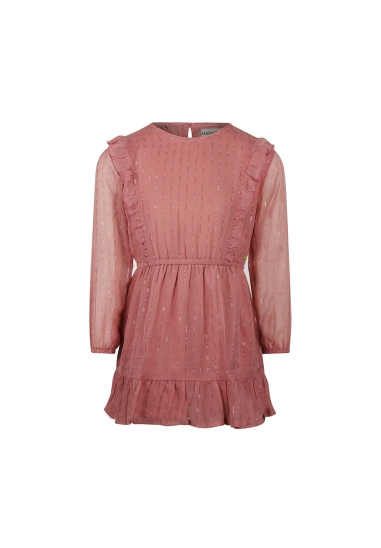 Deze Koko Noko jurk in de kleur roze is perfect voor meisjes van 2 tot en met 10 jaar. De jurk is voorzien van subtiele glinsterende details en ruffles langs de voorzijde. De lange mouwen zijn licht transparant, wat het geheel een extra stijlvolle touch geeft.