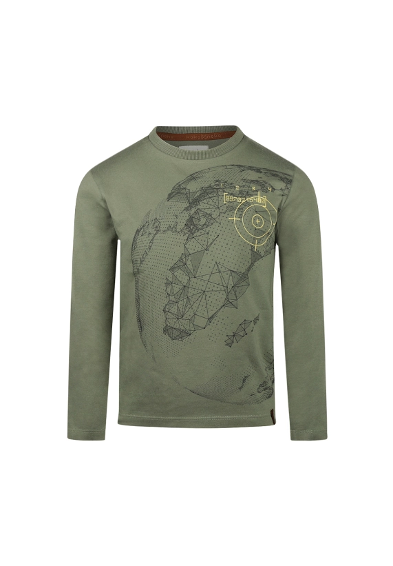 Dit groene jongens shirt van Koko Noko met lange mouwen is stoer en comfortabel. Op de voorkant staat een gave wereldbolprint in zwart en geel, wat zorgt voor een coole look. Het shirt is gemaakt van zachte, rekbare katoenmix, waardoor het lekker zit en veel bewegingsvrijheid geeft.