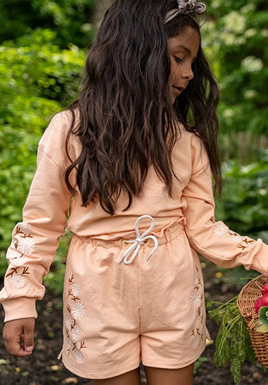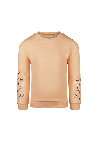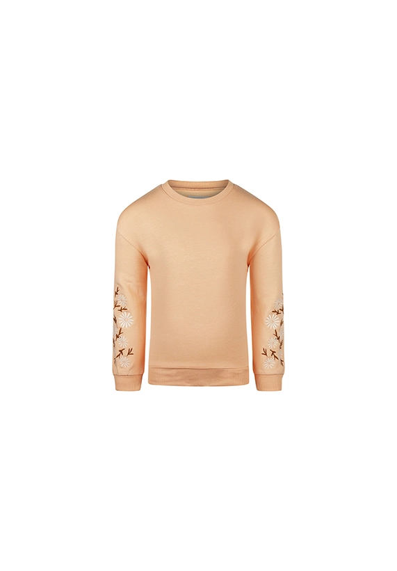 Sweater met ronde hals voor meisjes. De sweater heeft mooie geborduurde bloemen op beide mouwen en is van het toffe merk Koko Noko. De sweater is verkrijgbaar in een mooie perzik kleur die prima past bij de Koko Noko zomercollectie van 2025.
