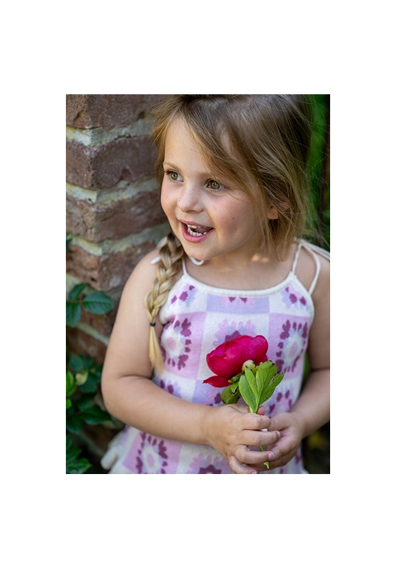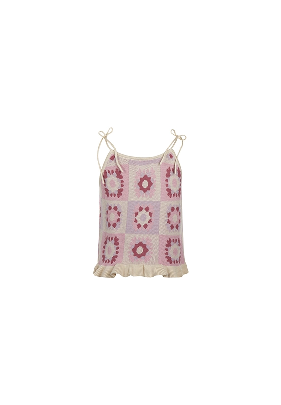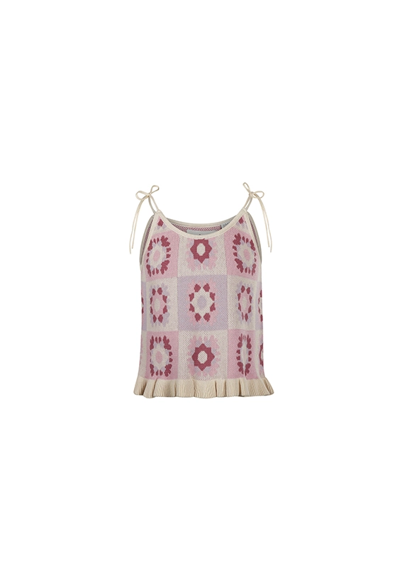 Topje met spaghetti bandjes voor meisjes. De gebreide top heeft een heel mooi patroon en rouches aan de onderzijde. De top is super te combineren bij de zomercollectie 2025 van het merk Koko Noko.