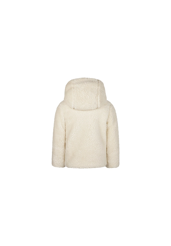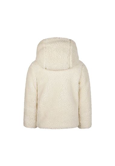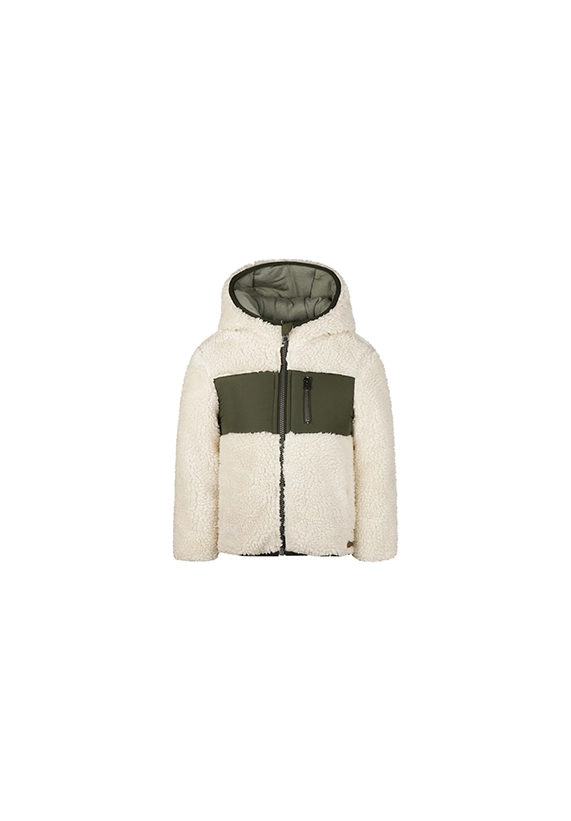 Winterjas voor jongens van het merk Koko Noko. De jas heeft een capuchon en groene baan. Verkrijgbaar in het ivoor wit.