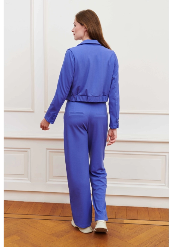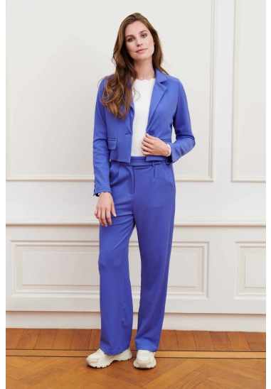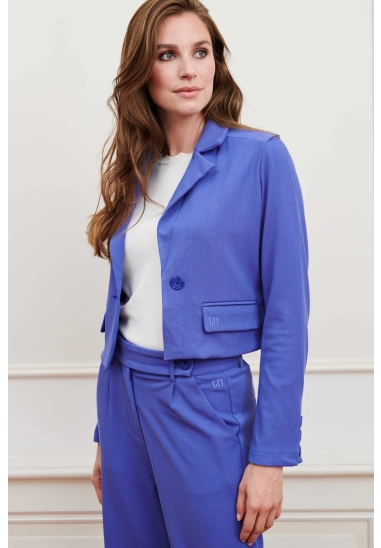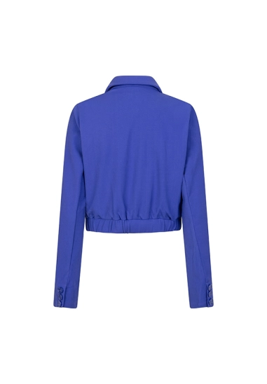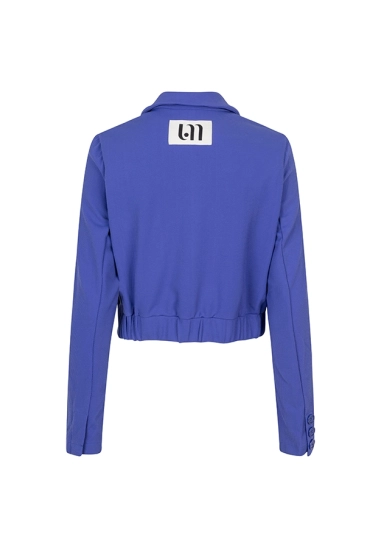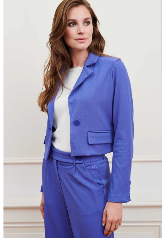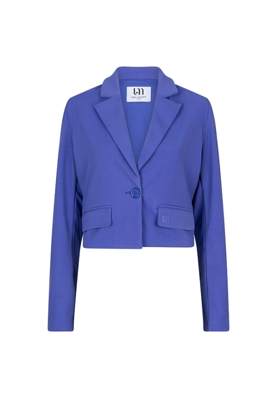 Een aangesloten korte blazer met een klassieke kraag, knoopsluiting en sierzakken. De blauwe blazer heeft schoudervulling, rechte mouwen en aan de achterkant elastiek in de tailleband.