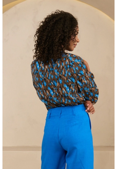 De Blouse Amina is een vrolijke, gekleurde blouse gemaakt van 100% polyester. De blouse heeft een mooie print en een rijgdetail bij de V-hals voor een speelse touch. De subtiele pofmouwen geven een vrouwelijke uitstraling en de lichte glinstering in de stof maakt de look extra bijzonder.