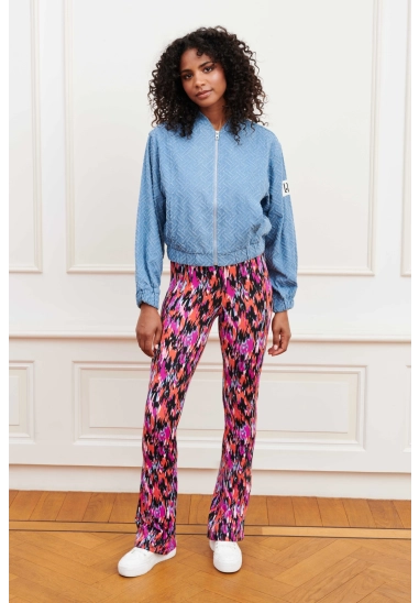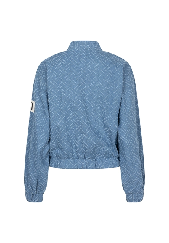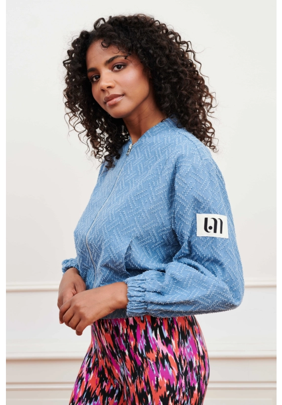 De blauwe bomberjacket heeft een ritssluiting en een elastieken band in de taille.