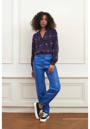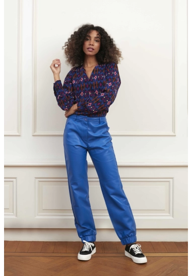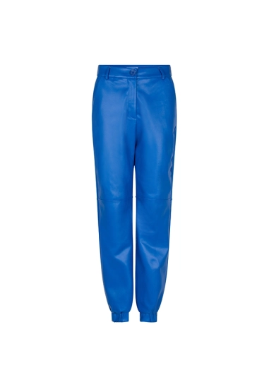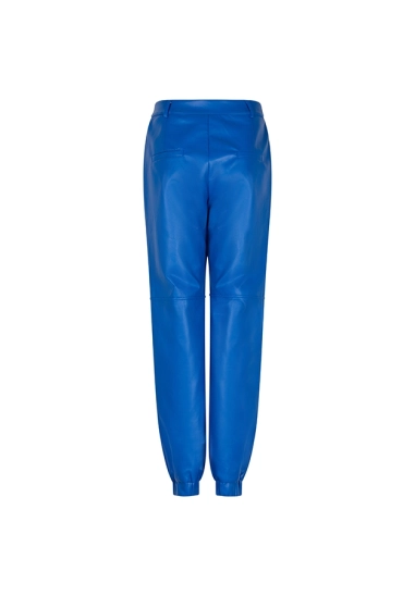 Broek Lydia voor dames is een blauwe broek gemaakt van vegan leather, voorzien van een knoop- en ritssluiting en riemlussen.