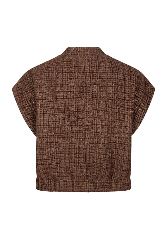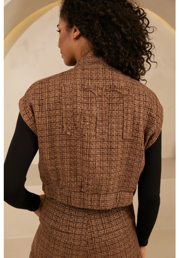Het gilet Salwa van Lofty Manner is een kort tweed gilet met een lichte glinstering die je outfit net wat extras geeft. Het gilet is bruin, heeft een ronde hals en knopen aan de voorkant. De verlaagde schouders zorgen voor een losse, comfortabele pasvorm.