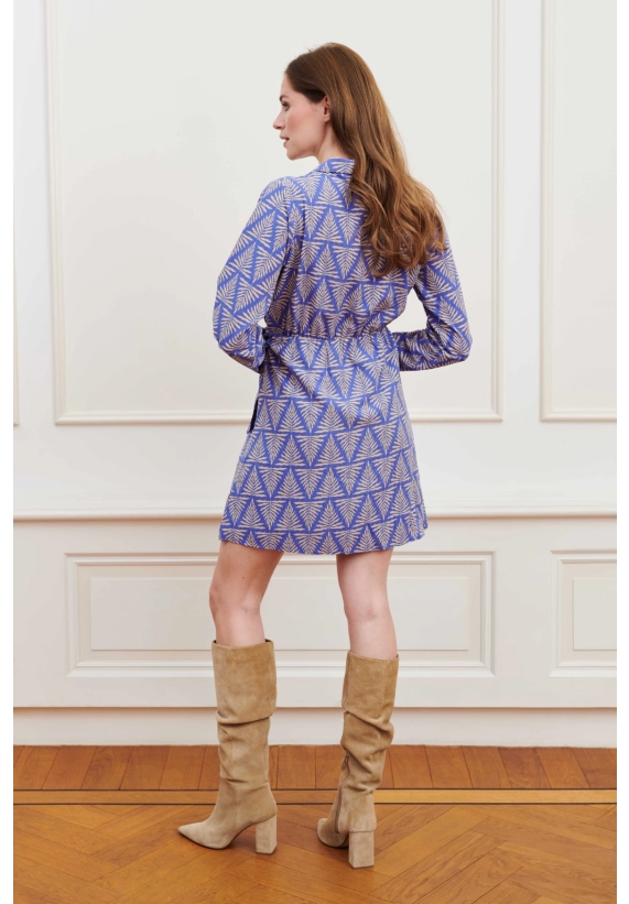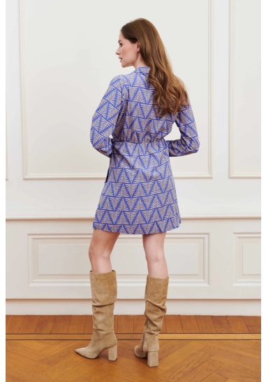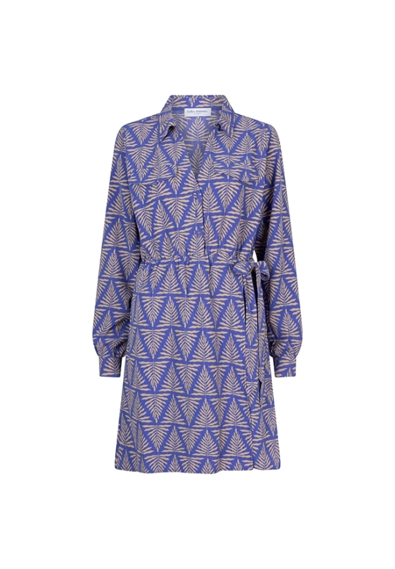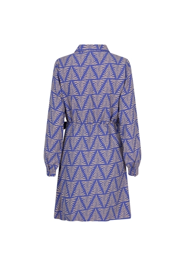 Een gekleurde jurk met V-hals en knopen tot aan de taille. De jurk heeft een klassieke kraag, sierborstzakken en een elastiek in de taille. De jurk heeft een strikdetail aan de linker draagkant en knoopjes bij de mouwuiteinden.