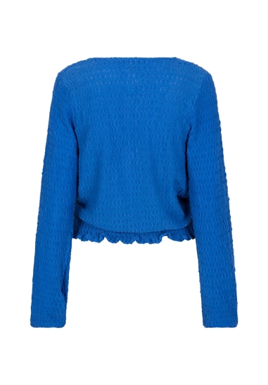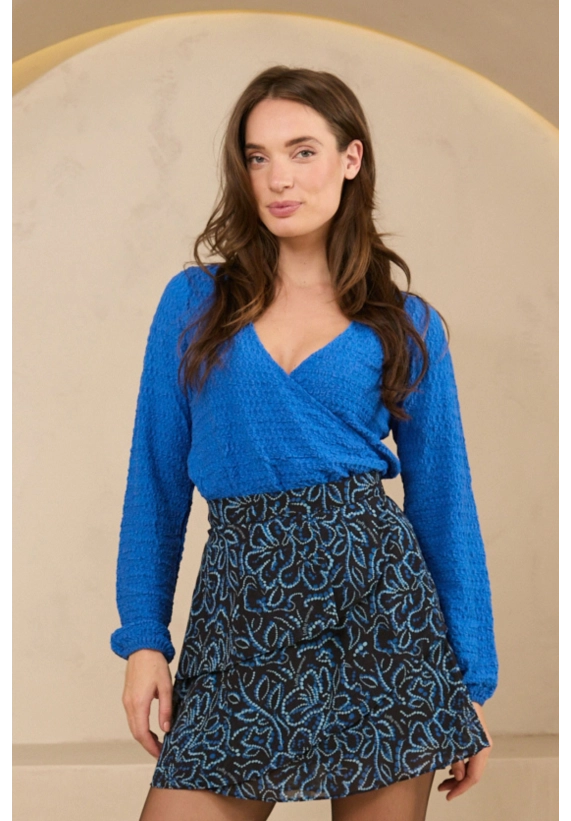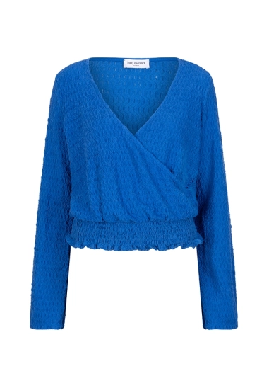De top Nour is een stijlvolle, blauwe wrap top met een smock tailleband die mooi aansluit in de taille. De stof valt losjes om het lichaam voor een luchtige en comfortabele look.