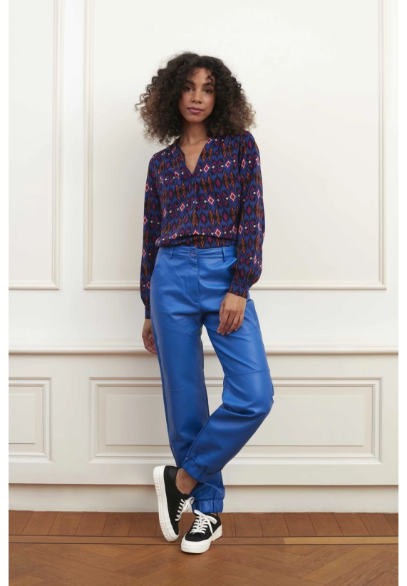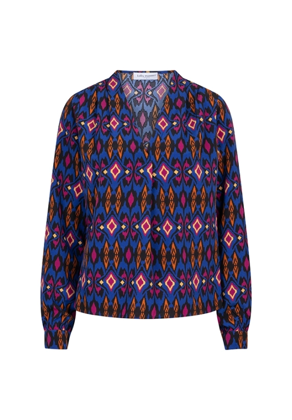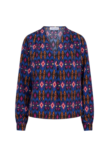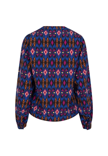 Shirt Mia voor dames is een kleurrijk shirt met een V-hals en een plooidetail op de schouders.