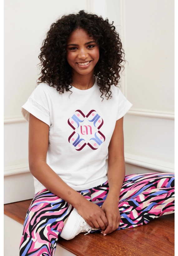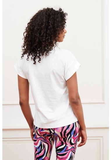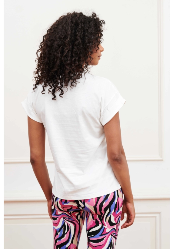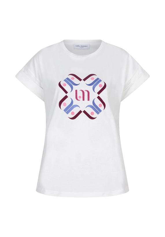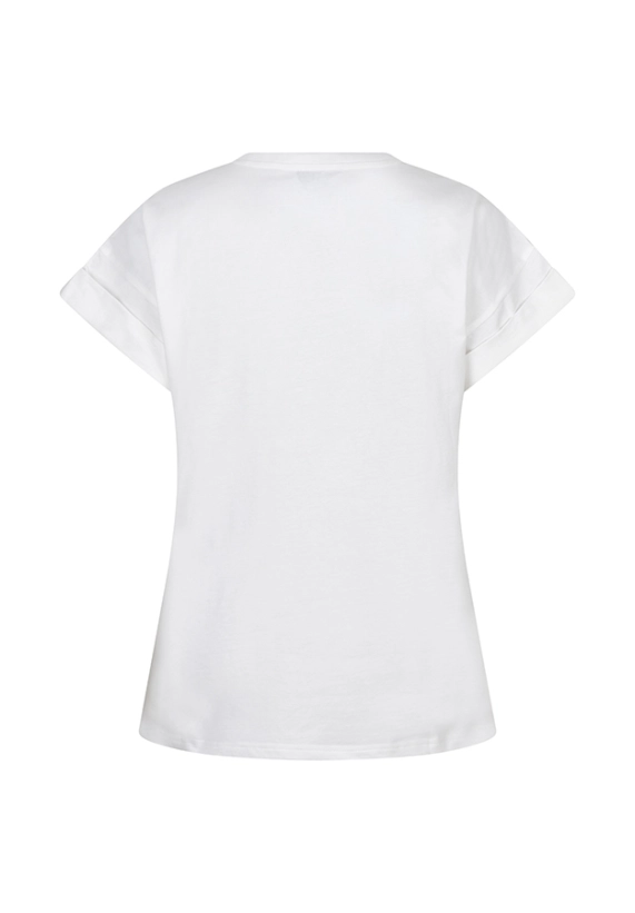 Een losvallend wit shirt met een ronde hals. De mouwen van het T-shirt zijn omgeslagen en de voorkant is voorzien van een artwork.
