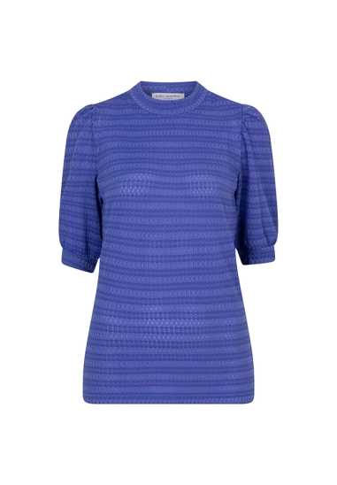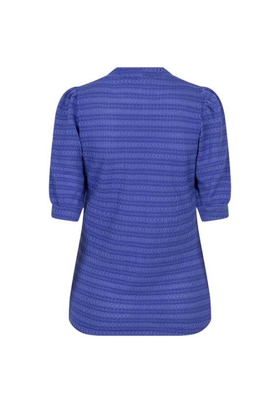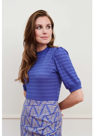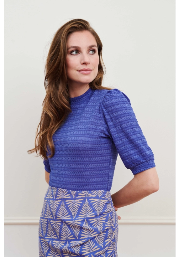 Een aangesloten blauwe top met een patroon in de stof, een hoge ronde hals en mouwen tot aan de elleboog. De top bevat veel stretch.