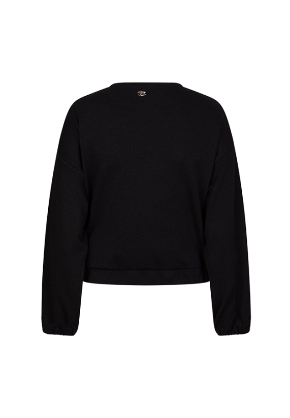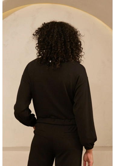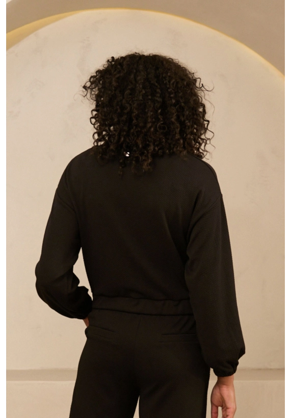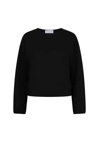 De top Amala is een veelzijdige zwarte top met een ronde hals en een elastische taille, waardoor hij mooi in model blijft en toch losjes zit.