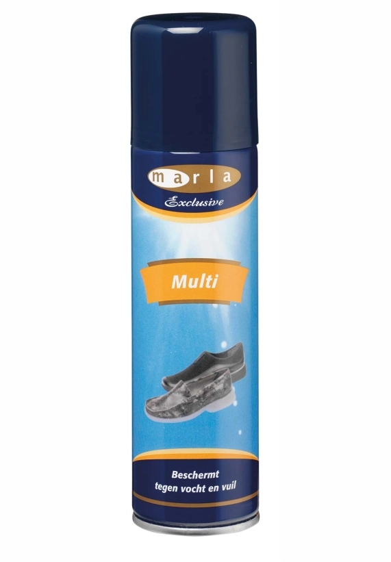 Multi spray voor schoenen van het merk Marla. Een water- en vuilafstotende spray, geschikt voor schoenen, laarzen, jassen, tassen e.d. die vervaardigd zijn uit kunstmaterialen zoals, croco, stretch, suedine en metellics of combinaties hiervan. De spuitbus is 250 ml.