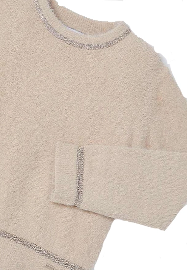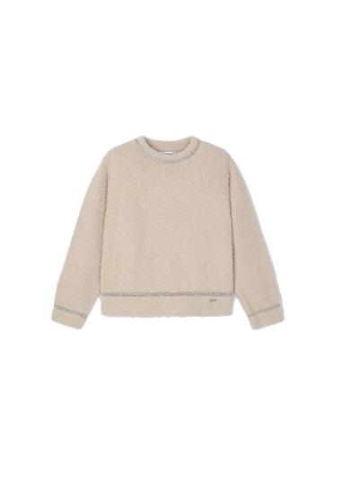 Fluffy trui met metallic randje voor meisjes van het merk Mayoral. Deze heerlijke zachte sweater is verkrijgbaar in het beige en roze.