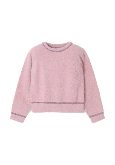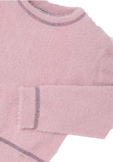 Fluffy trui met metallic randje voor meisjes van het merk Mayoral. Deze heerlijke zachte sweater is verkrijgbaar in het beige en roze.