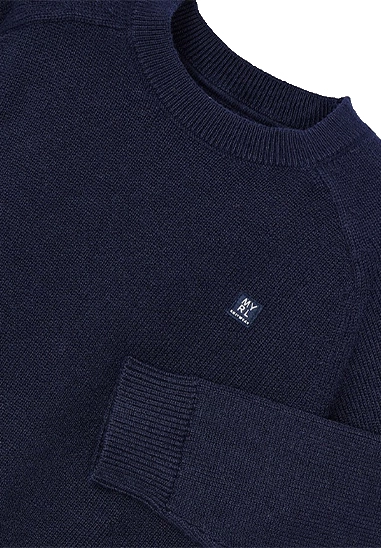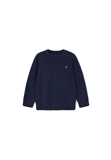 Gebreide pullover voor jongens van het merk Mayoral. De trui heeft een ronde hals, is uni van kleur en heeft een badge op de borst. Verkrijgbaar in licht blauw, donker blauw en zand.