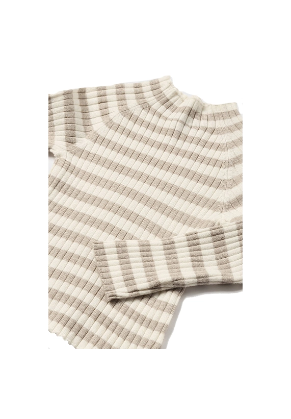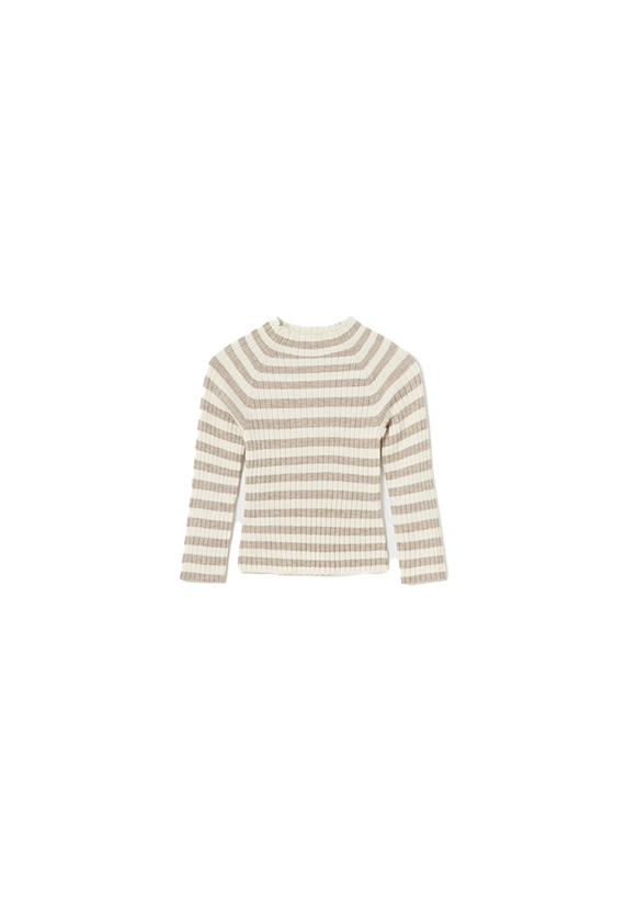 Gestreept truitje met turtle hals voor meisjes van het merk Mayoral. Vergrijbaar in een ivoor witte met beige horizontale streep.