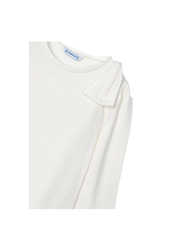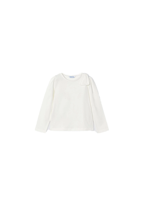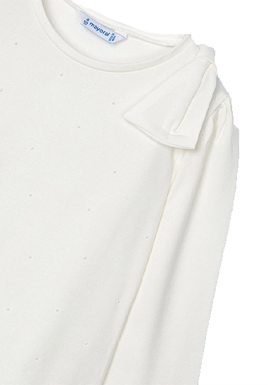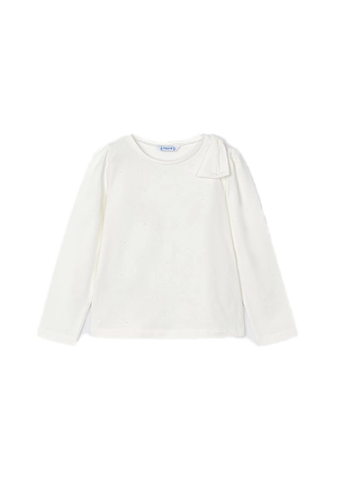 Shirt met lange mouwen voor meisjes van het merk Mayoral. Deze longsleeve heeft leuke ingedrukte stippen en een strik op de schouder. Verkrijgbaar in ivoor wit en roze.